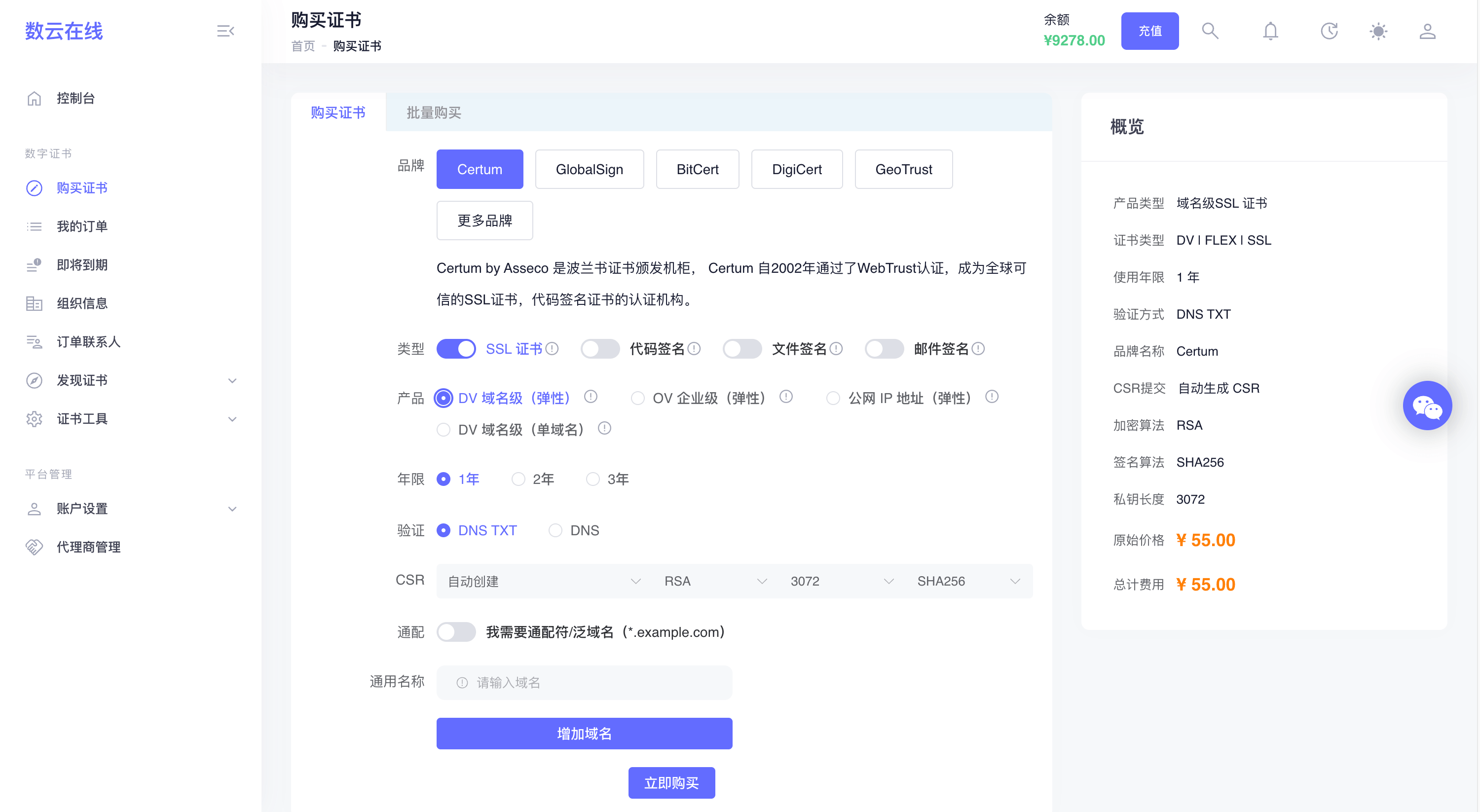 我们在证书的申请流程、签发速度、证书管理等由着你无法忽略的优势